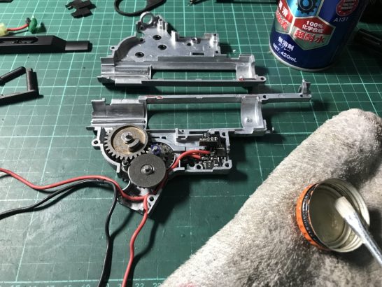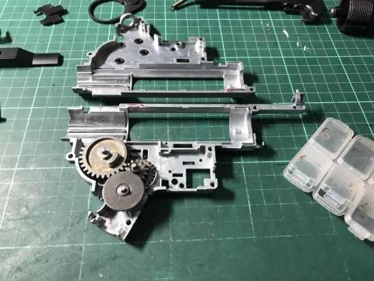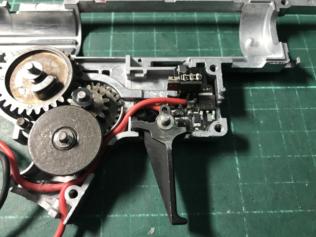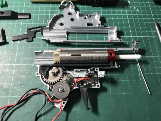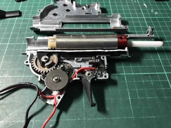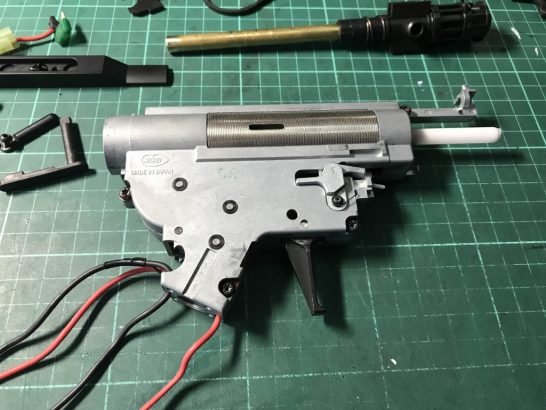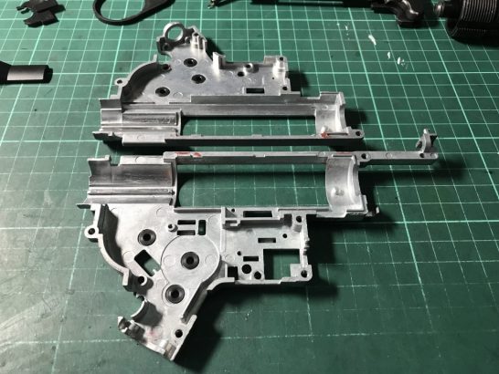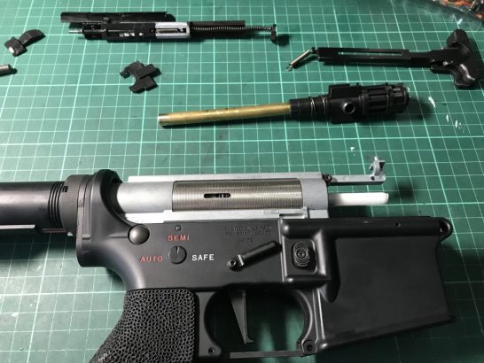 トリガーのストロークは問題なかったんですが、トリガーがメカboxとロアレシーバーに干渉していたので、当たる部分だけ少し削り磨いておきます。