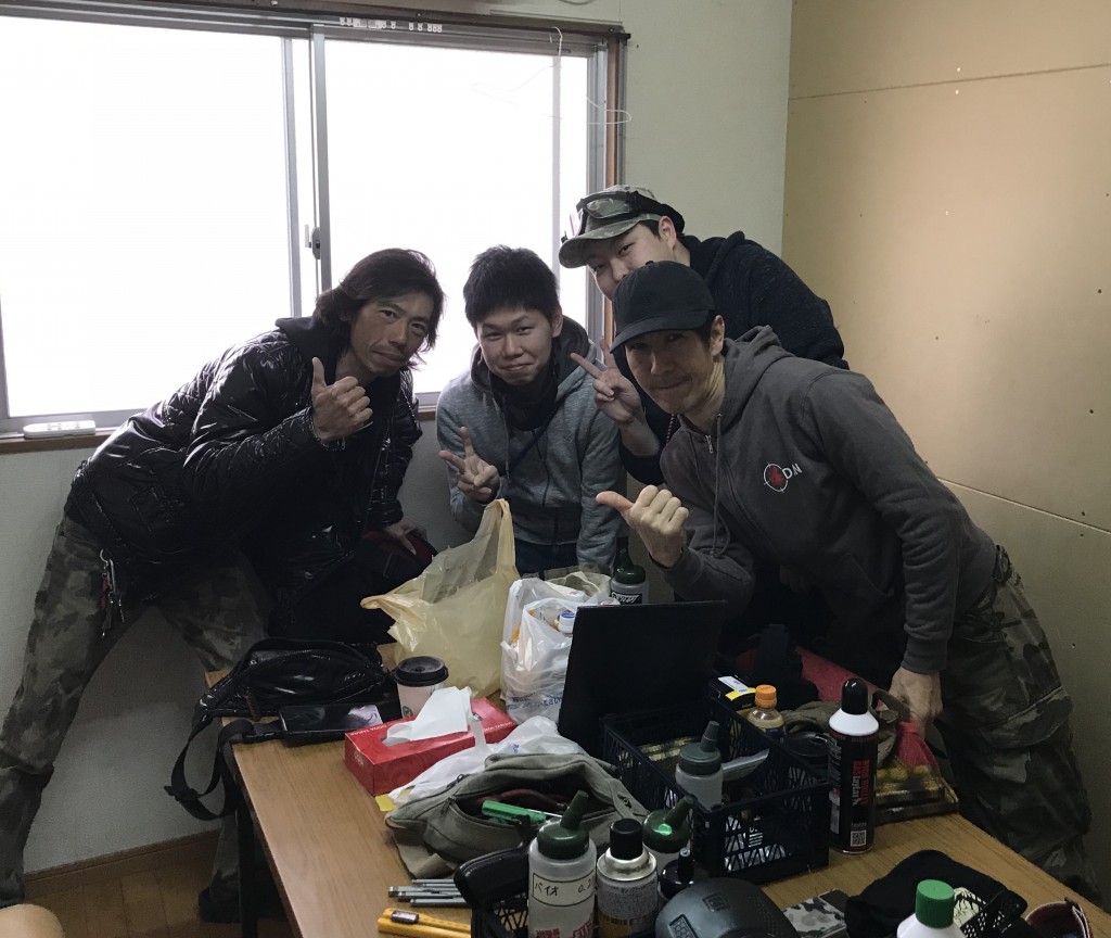 ちなみこちらの写真で天井からぶら下がってる銃の暖簾的な軍団は、キャンプ大原参加時に全て使えなかったNutsの銃達です(笑)